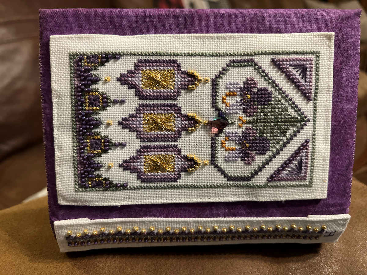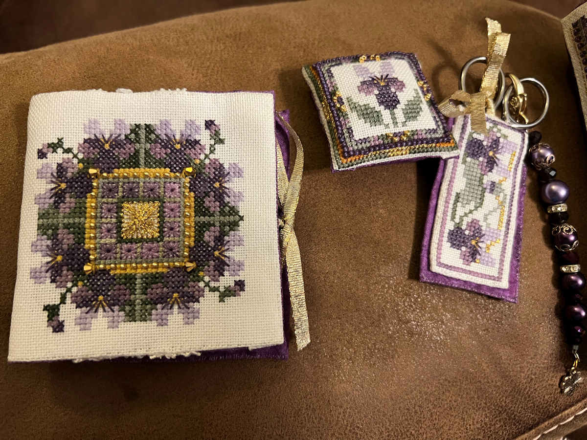 You will stitch mostly cross stitch, a few Special Stitches, with diverse threads and braids, beads, and sew-on sparklies and treasures.