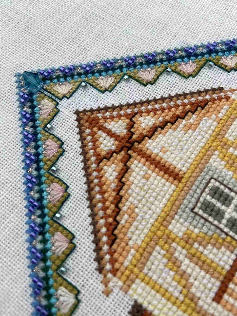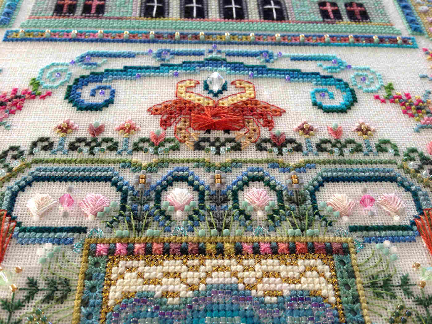 You will use many different threads, sparkling and matte, silk and cotton plus beads and crystals to create this embroidery. Additionally, to the basic cross stitches, there are some Special Stitches, which will give texture, dimension and are entertaining to work. All will be well explained by diagrams!