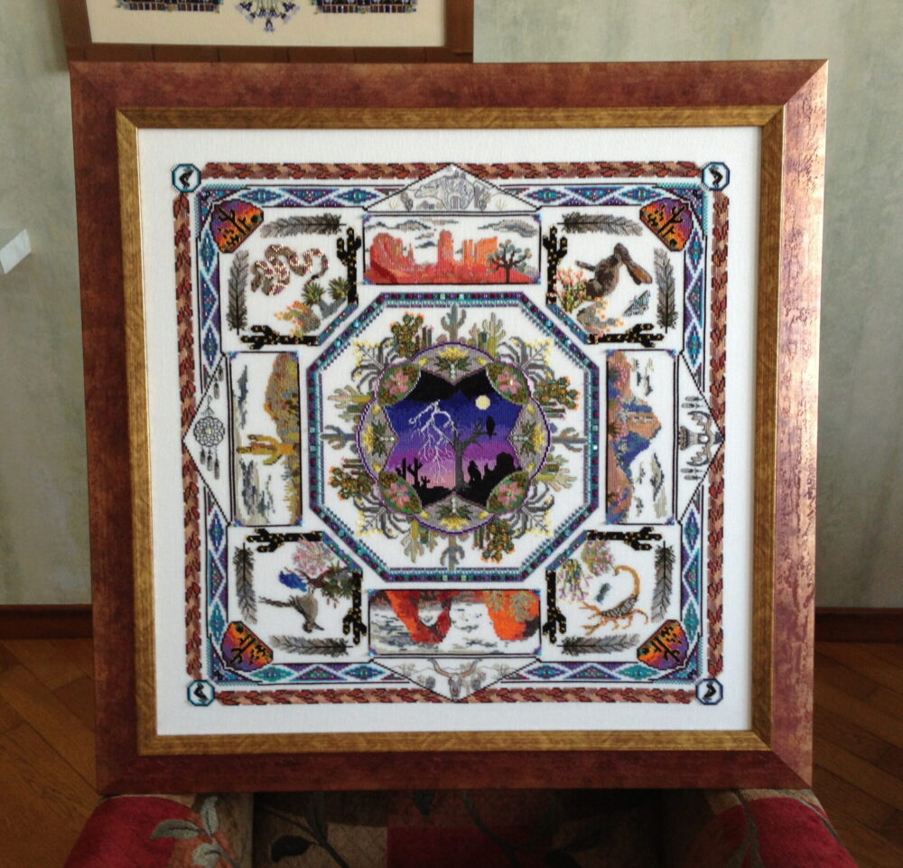 Here you can stitch a collection of impressive pictures of desert landscapes animals and flora. Typical colors of the South-West together with stylized patterns of Native Americans give a warm and “desert-y” feeling. Beautiful shades in silk, variegated and solid with other interesting threads, beads, crystals – all are used to create this stitched piece of a wonderful landscape.