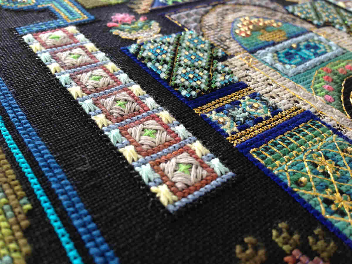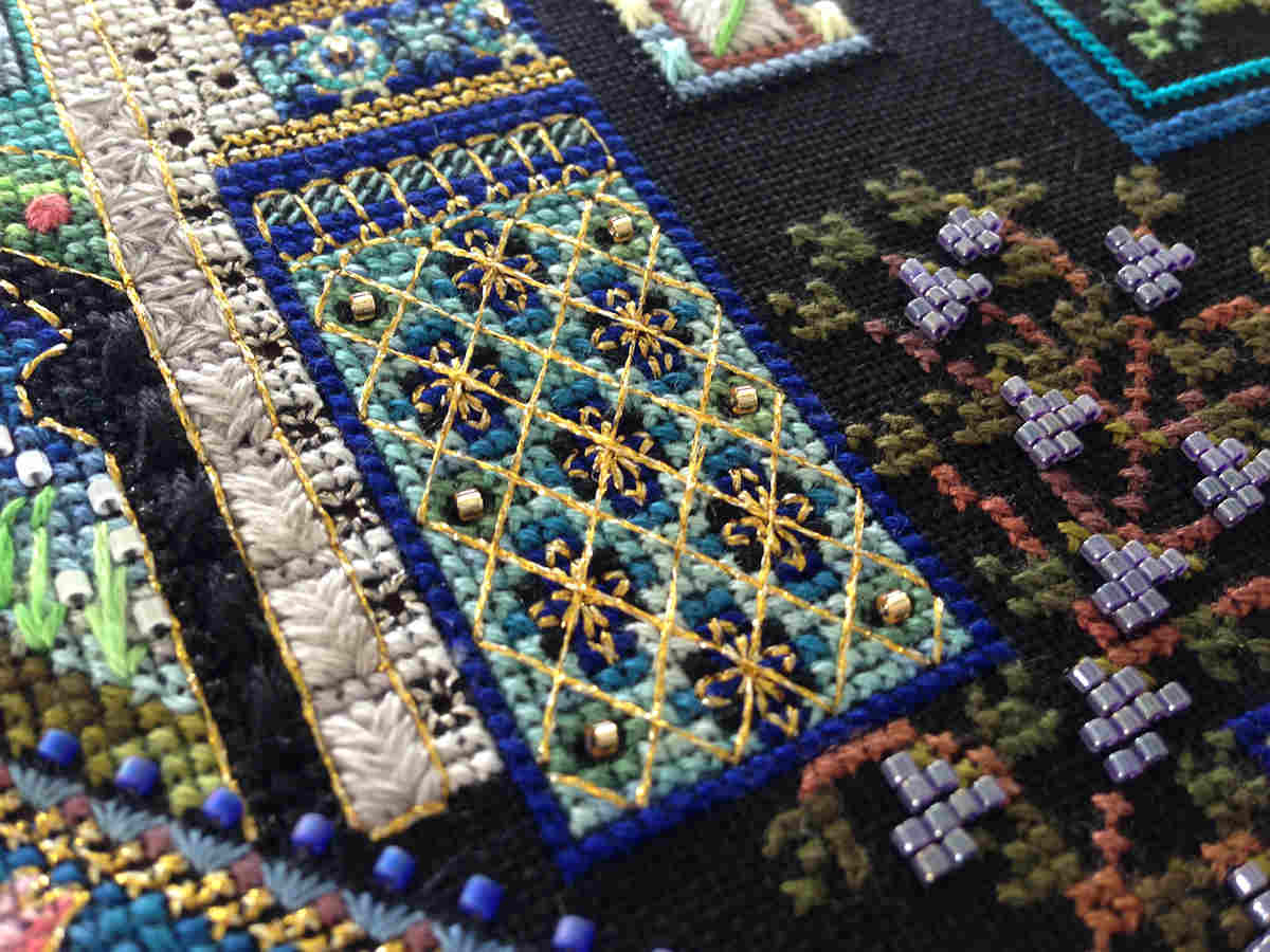 This piece incorporates many delicious threads and materials and many beads and crystals. You will use a variety of Special Stitches, all well explained with PDF diagrams you can enlarge to your own needs.