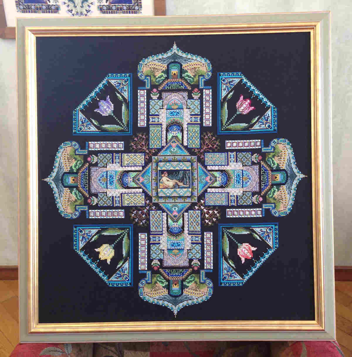 With this design you receive a detailed over-one pictures of a bathing Odalisque after a painting of Ingrès – if you do not like to stitch that tiny stitches, there is an option for an easier normal cross stitch ornamental center. Please look at the detail cut-outs for a feeling which intricate embroidery you can work here !