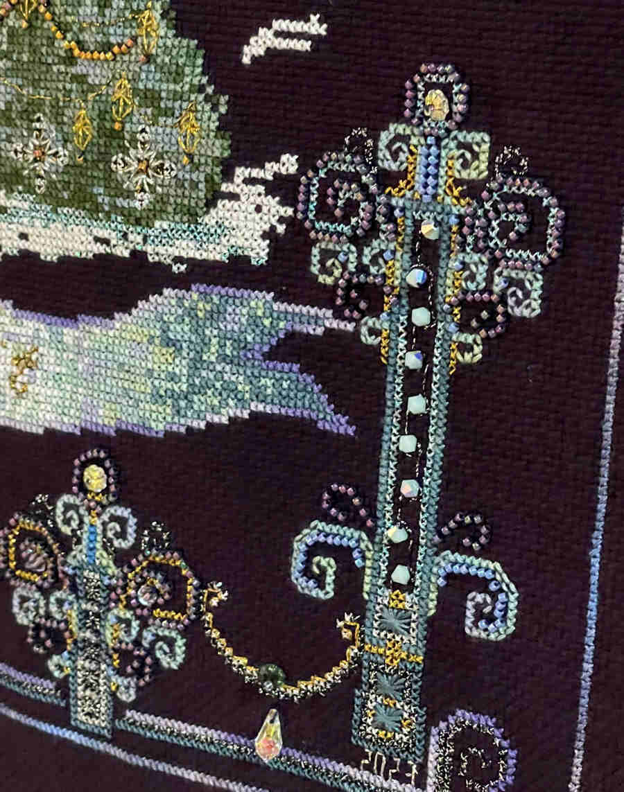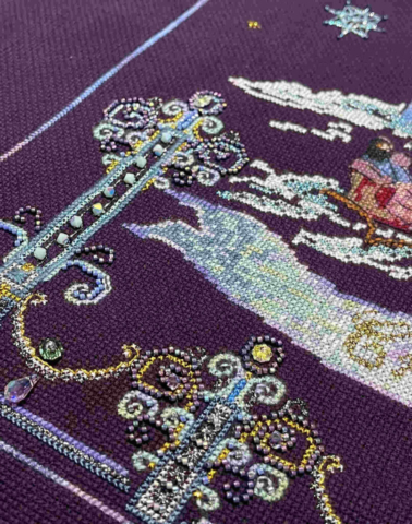 You can add Christmas greetings in several languages to your taste . For the stitching we use diverse threads, silks, metallic braids as well as beads and crystals for the real sparkle! Together with normal cross stitches  you embroider Special Stitches for lovely effects.