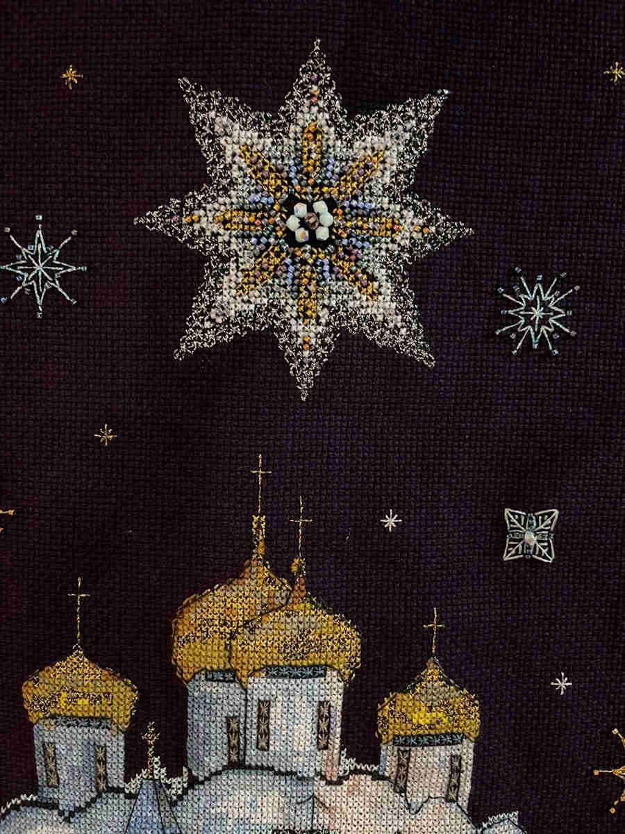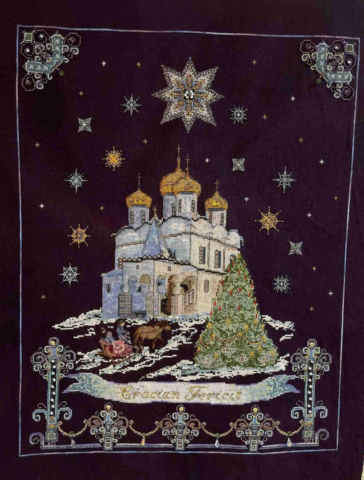 This is a true Winter’s piece – sparkly, cold, icy – the beautiful image of a Russian church with the typical onion domes. A sparkling and ornamented Christmas Tree in the foreground, a sleigh with horses dashing by… stylized stars in the skies… ornaments in the corners and as a fence-like border at the bottom – you have it all.