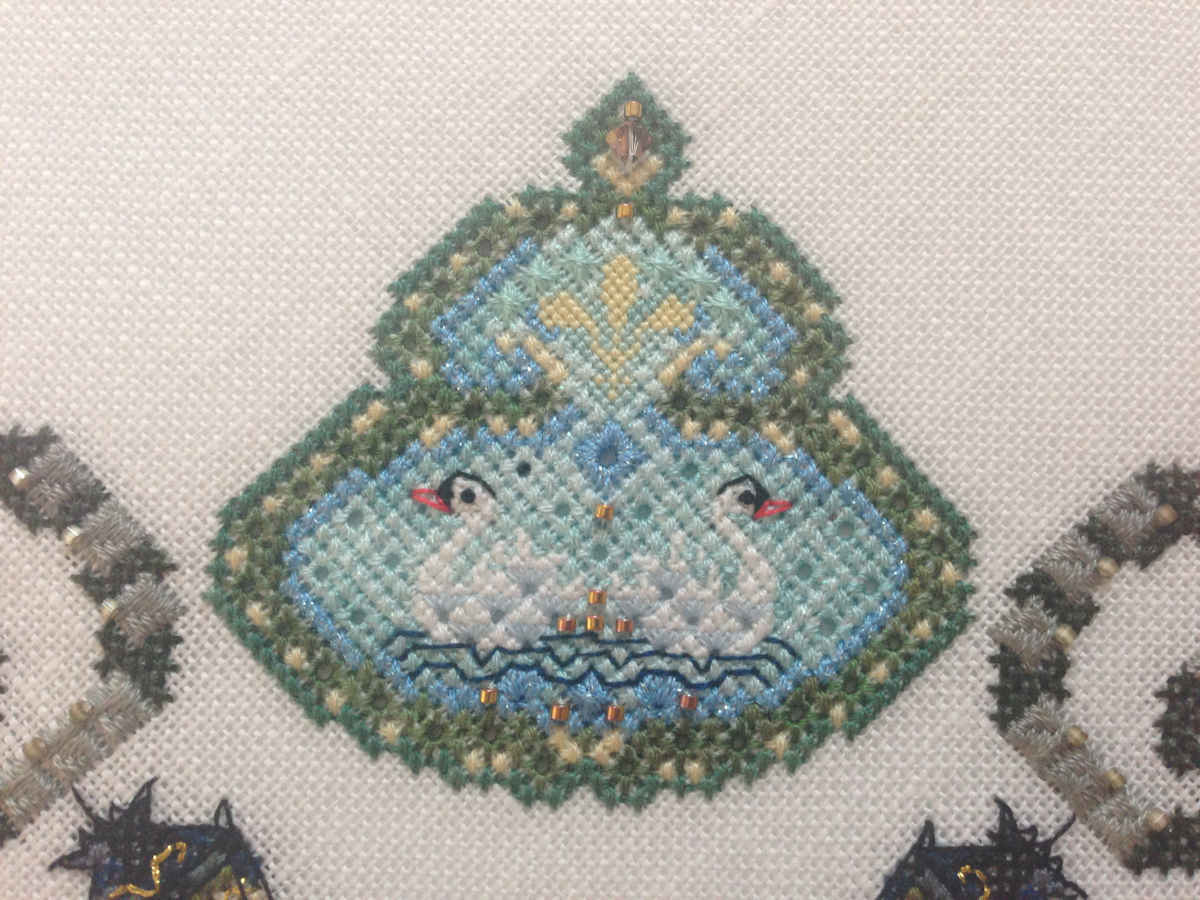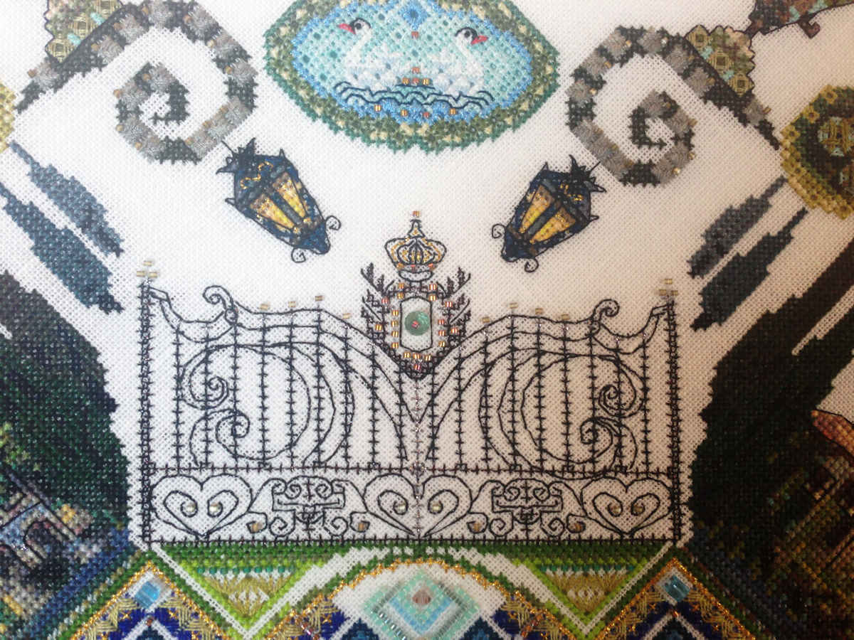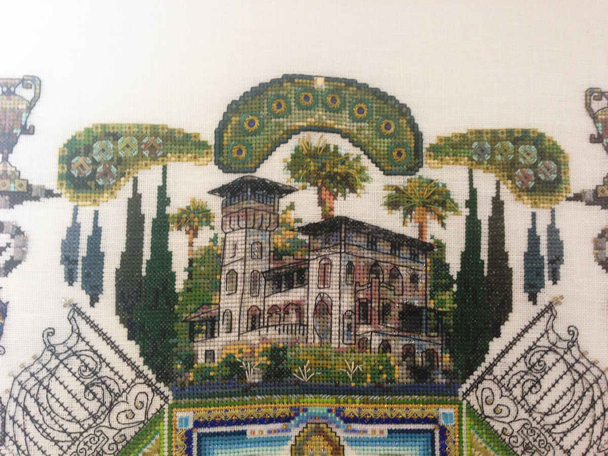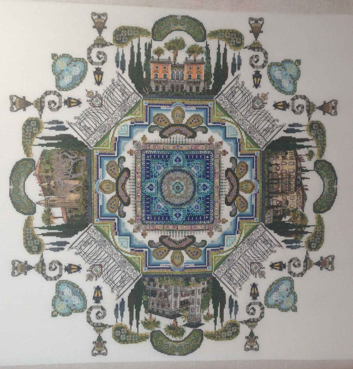 This design is again a Mandala – with different sides, views and villas. The lush landscapes of North Italy are captured in small views with lots of intricate stitching. The famous Villas at the Lake Como are embedded in ornamental parts of this Mandala. You will stitch mainly cross stitch which is embellished with many different Special Stitches, using variegated silks, metallic braids, silk perles and many other interesting threads. Beads and Crystals are used for further adding interest to your embroidery.