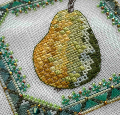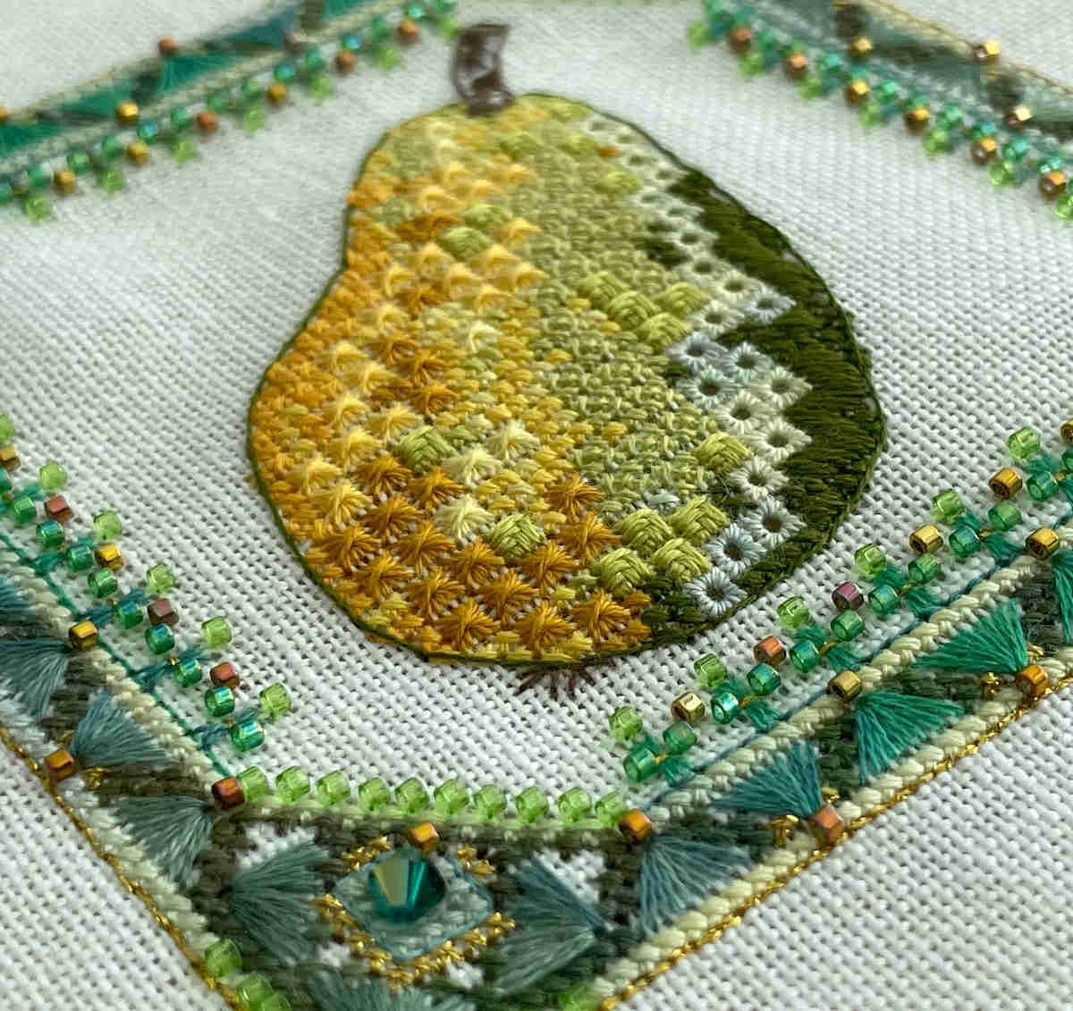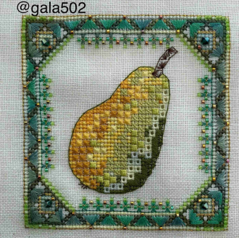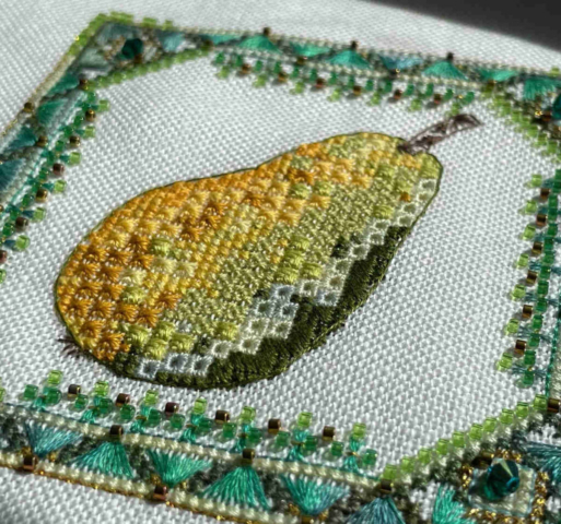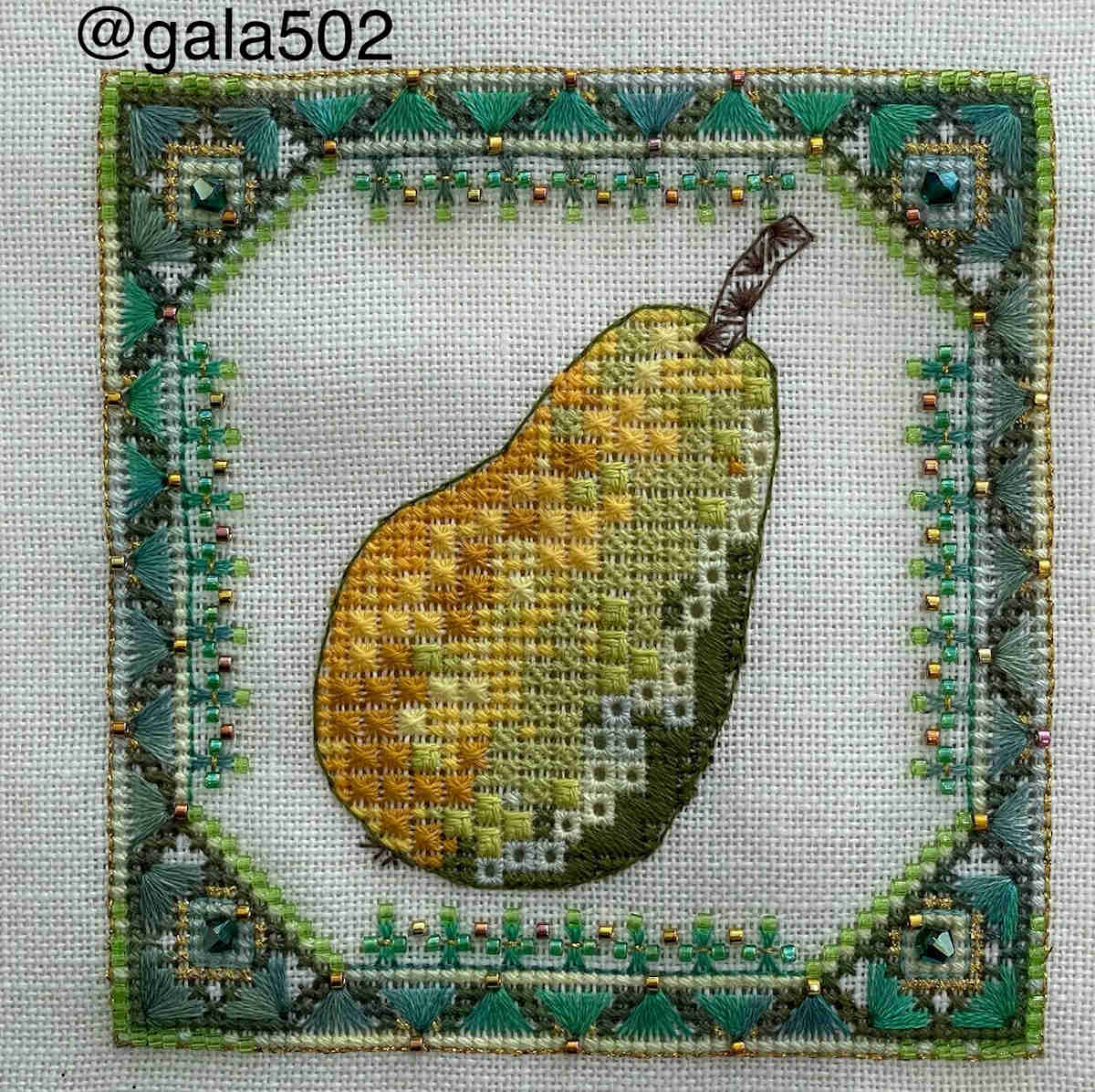This 1st design in this series of four small fruit pictures shows one beautiful juicy and shining ripe Pear – filled with Special Stitches galore and framed with a beautiful and decorative frame.