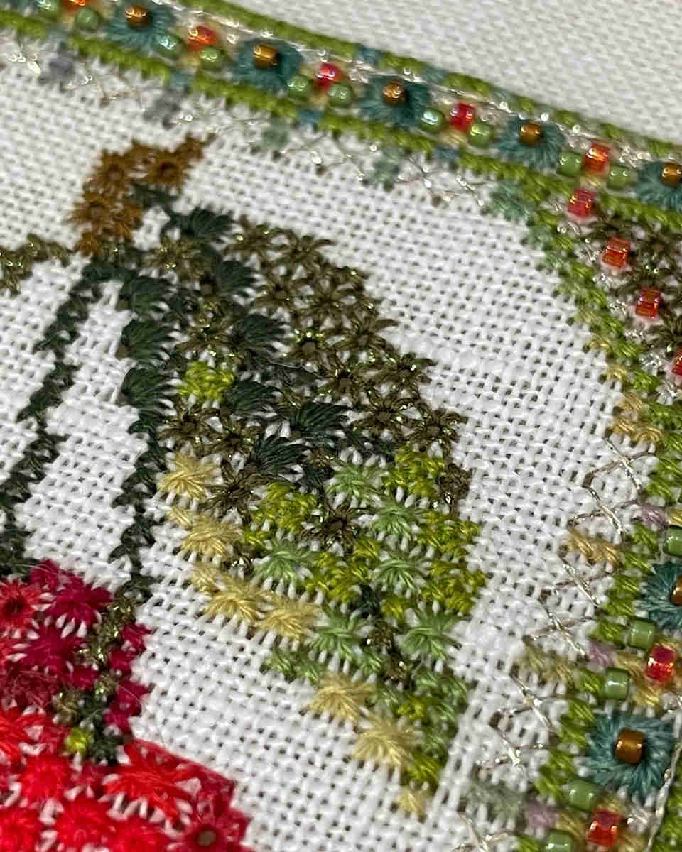 You will use normal cross stitch and Special Stitches, normal DMC cotton floss as well as beautiful silk fibers, etc., and adorn the entire embroidery with some beads too.