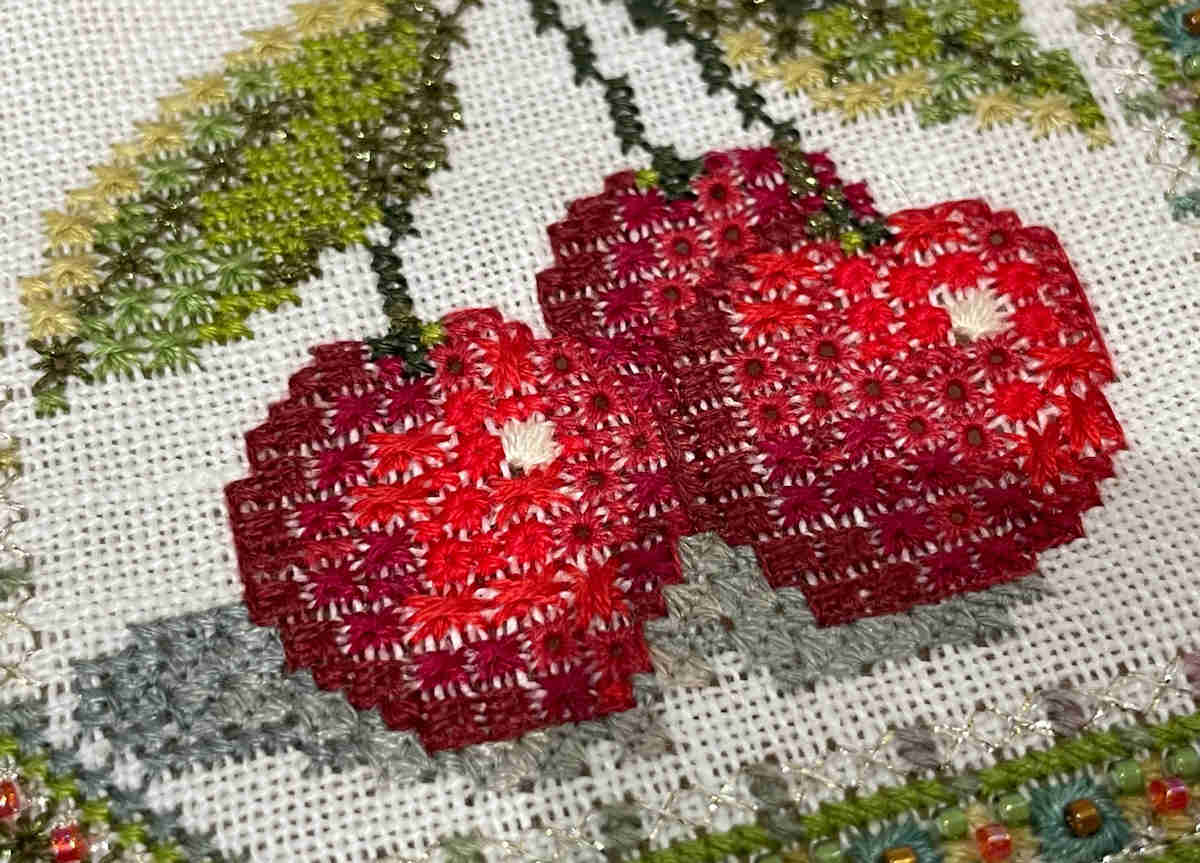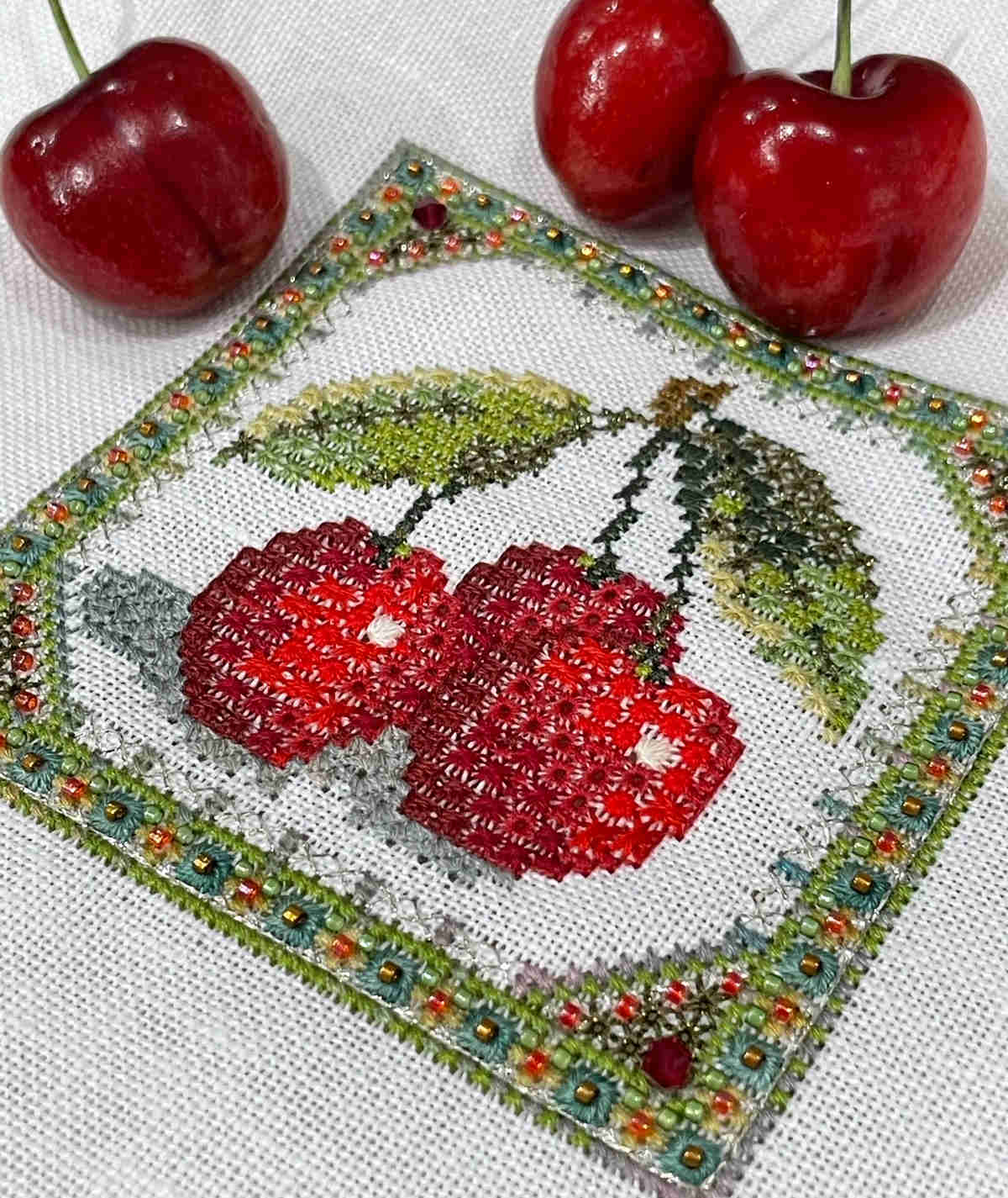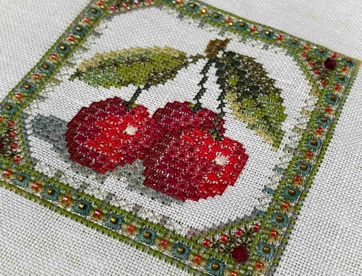 This 4th design in this series of four small fruit pictures shows some juicy and seductive cherries – filled with Special Stitches galore and framed with a beautiful and decorative frame.