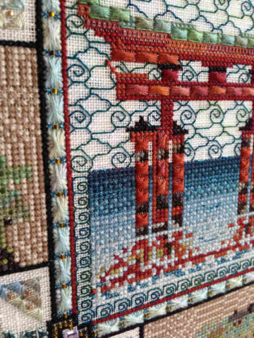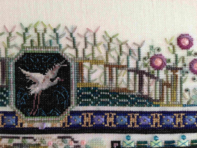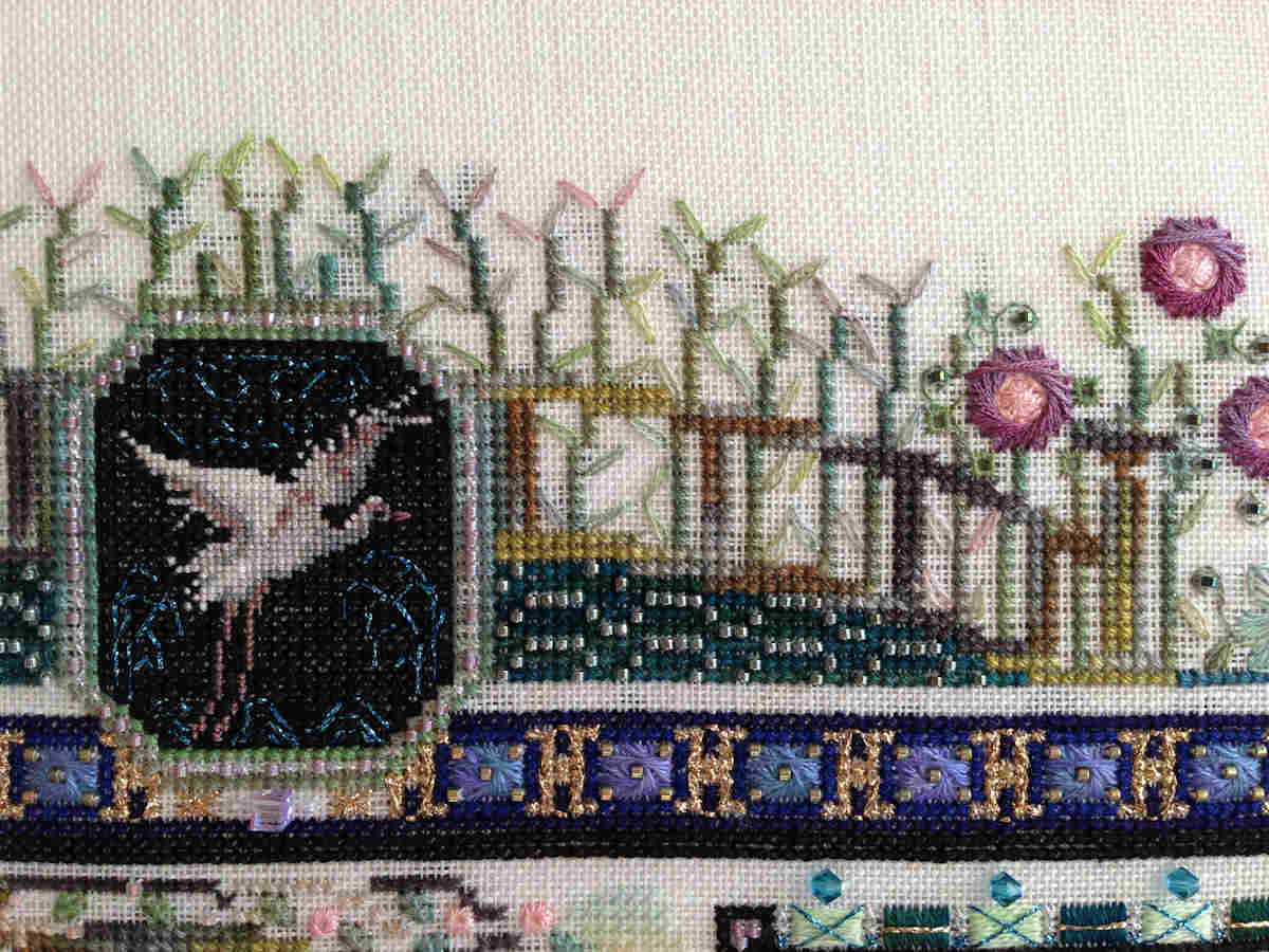 You will stitch a base of normal cross stitch, which is embellished by many well-explained Special Stitches.