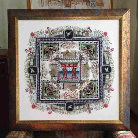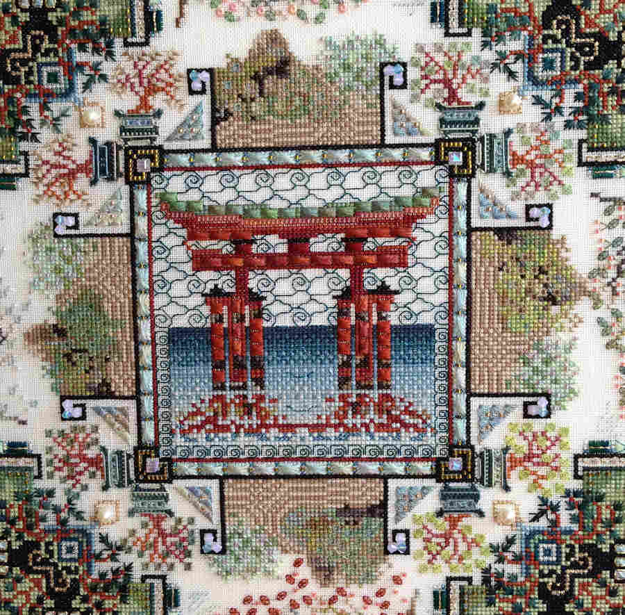 A beautiful Japanese Garden, filled with secret corners, lit by lanterns – the center embellished by a view of a Tori in the sea. Lots of plants, flying cranes – many symbols used in Japanese art.
