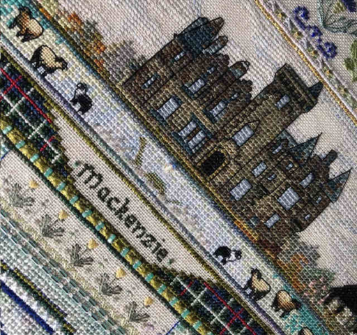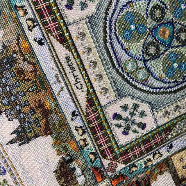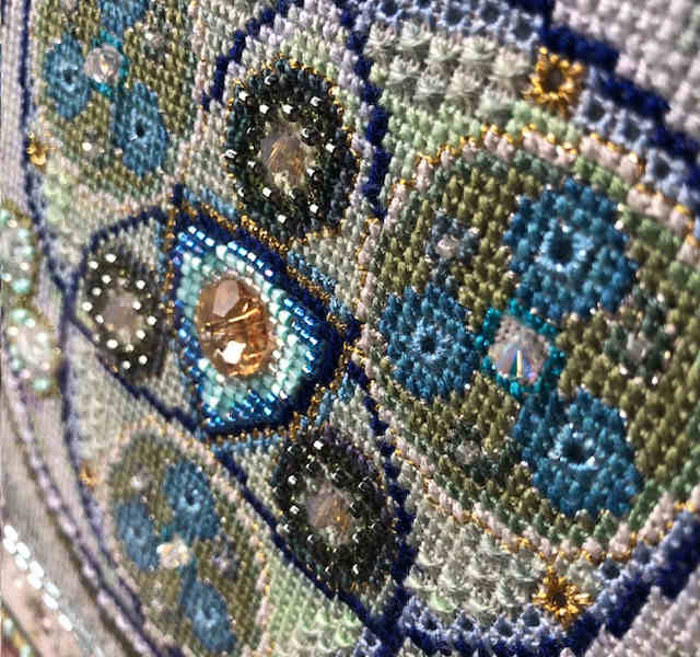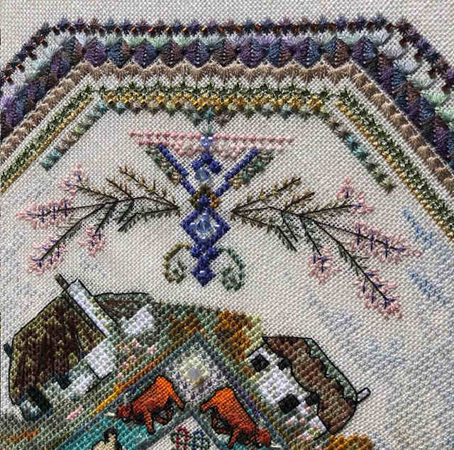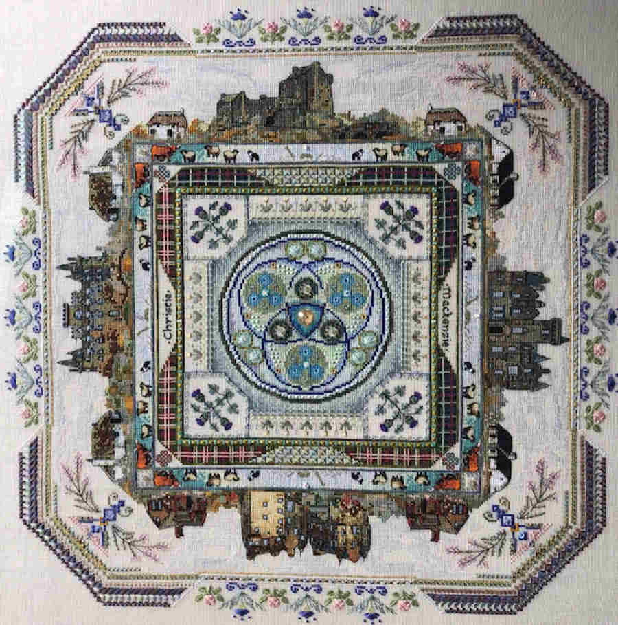 You find stylized Thistles and Roses – and the meadow flowers too. In the center is a Triscele – an ancient Celtic Symbol – but from there the design develops into my trademark Mandala …..This design is full of whimsical extras you will discover in the stitching process – and impressive larger motifs :
