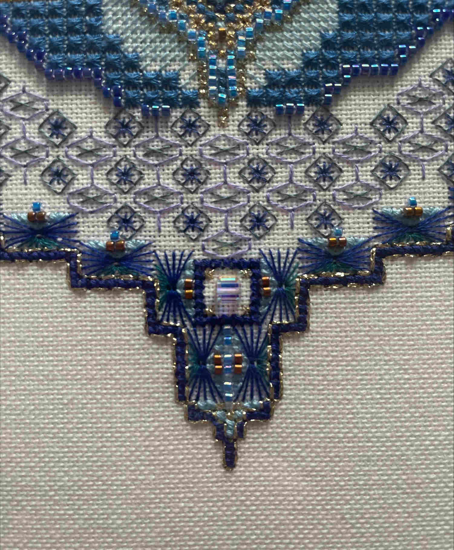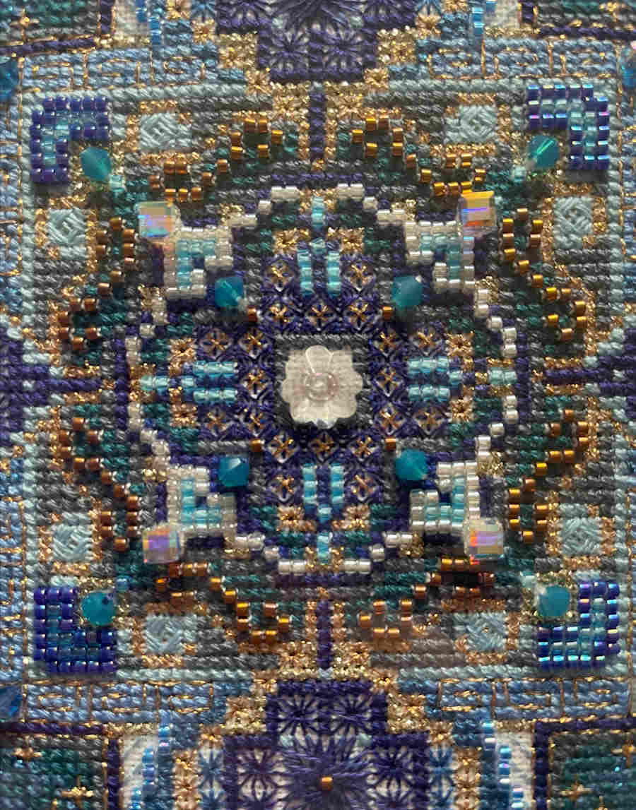 Here you can feed your inner queen with a glorious use of hand-dyed threads and metallics, diverse beads, and Swarovski crystals. The Special Stitches which are used besides the normal cross stitch give a nice texture and showcase wonderfully the flow of color of the variegated threads.
